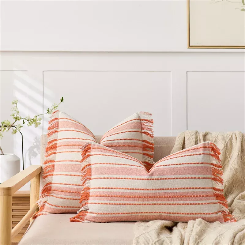 Crafted using a yarn-dyed jacquard technique, this cushion cover showcases a stylish geometric stripe pattern that feels both modern and timeless. Tassel fringes on each corner add a soft, artisanal charm while maintaining a sleek, contemporary feel.