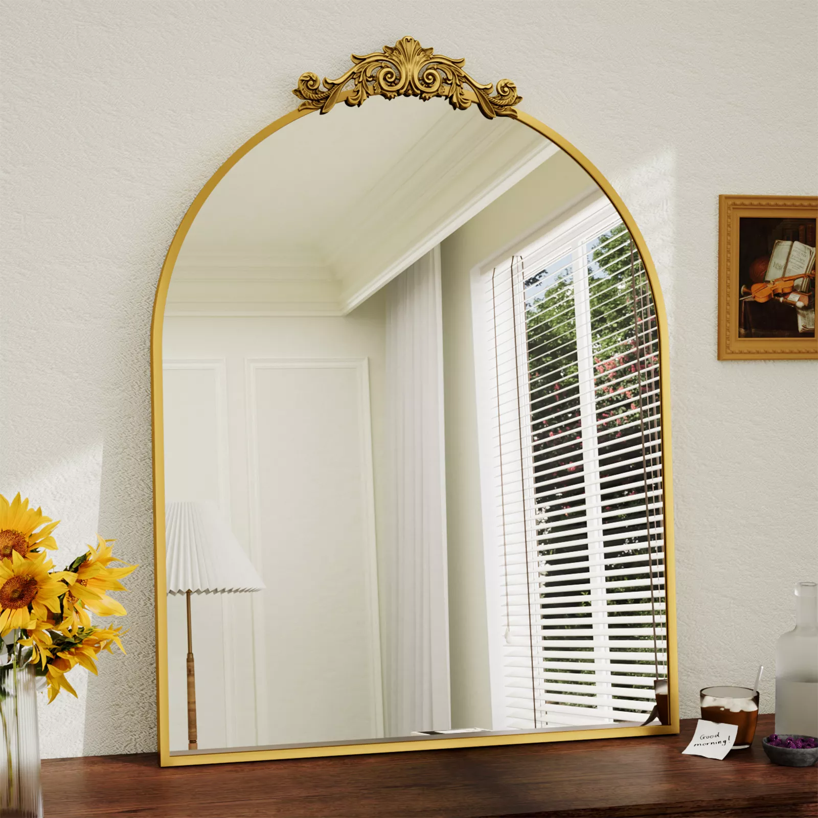 Perfect for bathroom vanities, entryways, or bedroom walls, this mirror instantly brightens your room and gives the illusion of more space. The gently curved top softens the overall look, while the gold-toned frame adds a warm, luxurious glow. Whether you’re freshening up in the morning or styling your home with thoughtful details, this mirror is an ideal choice.