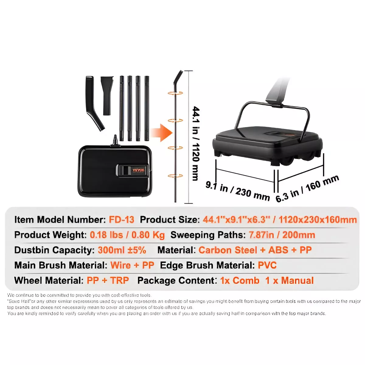 Manual Carpet Sweeper with 7.87in Path & 300ml Dustbin for Rugs & Hard Floors