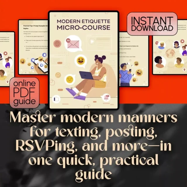 Unlike long or outdated etiquette manuals, the Modern Etiquette Micro-Course gives you fast, modern solutions to real-life digital dilemmas. With clear examples and real-world scenarios, it’s not about being perfect—it’s about being thoughtful and aware.