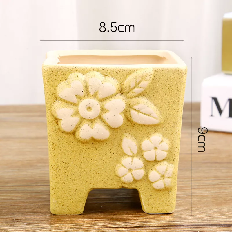 Crafted from high-quality pottery and finished with a smooth glazed coating, this flowerpot measures approximately 3.3 x 3.5 inches, making it compact yet eye-catching. Its square shape and artistic detailing add a timeless appeal to shelves, windowsills, coffee tables, or garden corners.