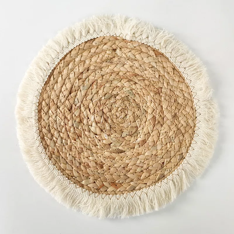 Bring warmth and texture to your table with this Round Woven Straw Placemat, crafted from eco-friendly water hyacinth and finished with a charming fringe edge. This stylish and functional mat is designed to elevate your dining experience while protecting your surfaces from heat, scratches, and spills. Its rustic, handcrafted look pairs perfectly with both modern and traditional settings, making it a versatile piece for everyday meals or special gatherings.