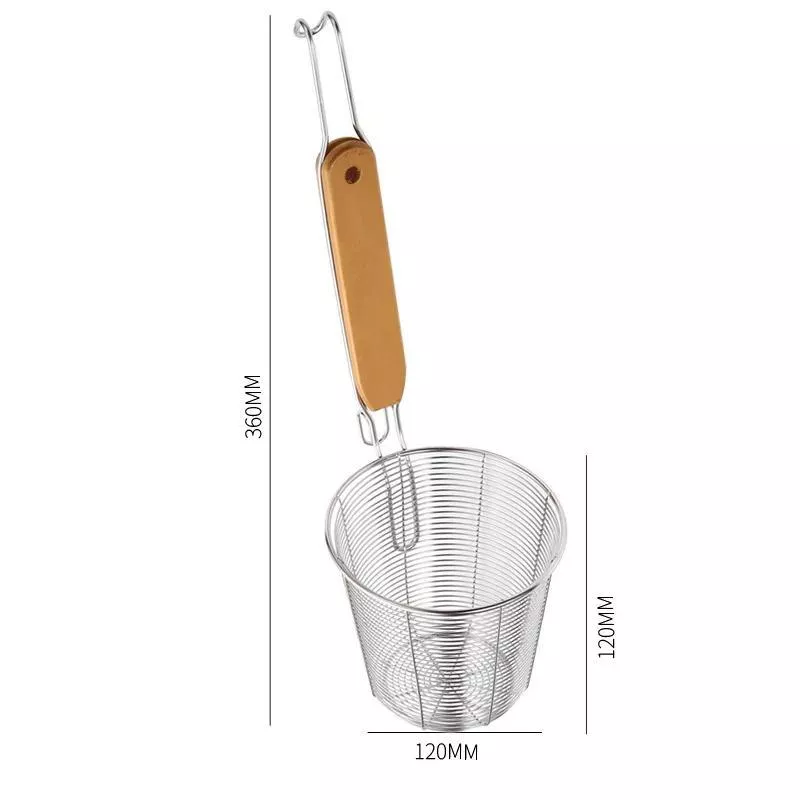 Made from thickened stainless steel and featuring a solid wood handle, it delivers a durable, heat-resistant build with a comfortable grip. The deep and wide basket provides ample capacity, making it ideal for cooking large batches in one go. Thanks to its clever hanging hook design, it conveniently rests on the edge of your pot — no more juggling hot baskets or dripping oil across the kitchen.